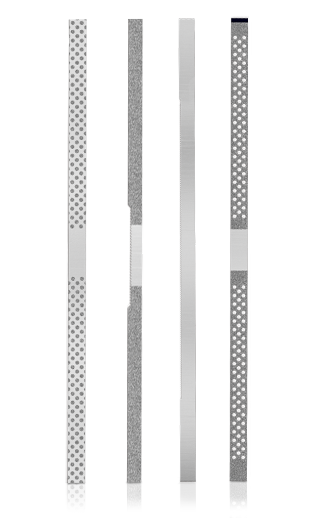 Manufactured from surgical-grade stainless steel and coated with aluminum oxide, these strips provide durable abrasion, smooth performance, and efficient finishing in interproximal adjustments. Available in coarse, medium, and fine grits, they deliver versatility for shaping, contouring, and polishing multiple restorative materials while maintaining stability during use.